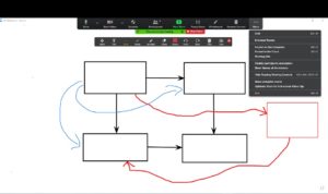 One of the Share Screen options in Zoom is a whiteboard. This brings up a blank screen. Look for the pencil icon to access drawing tools – at the top of the laptop screen and bottom of a tablet. Participants can now write and draw on the whiteboard using the tools available. To bring up the tools, look for the pencil icon at the top of a desktop or bottom of a mobile screen. Note that there may be a bit of a delay before the annotations appear on everyone’s screen.
