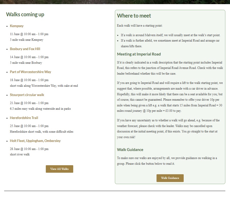 The website allows people to find out what walks are happening. They like to encourage you to join the group after a couple of walks with them. To encourage this, there is a members’ area where more details of the walk are made available to only to members.